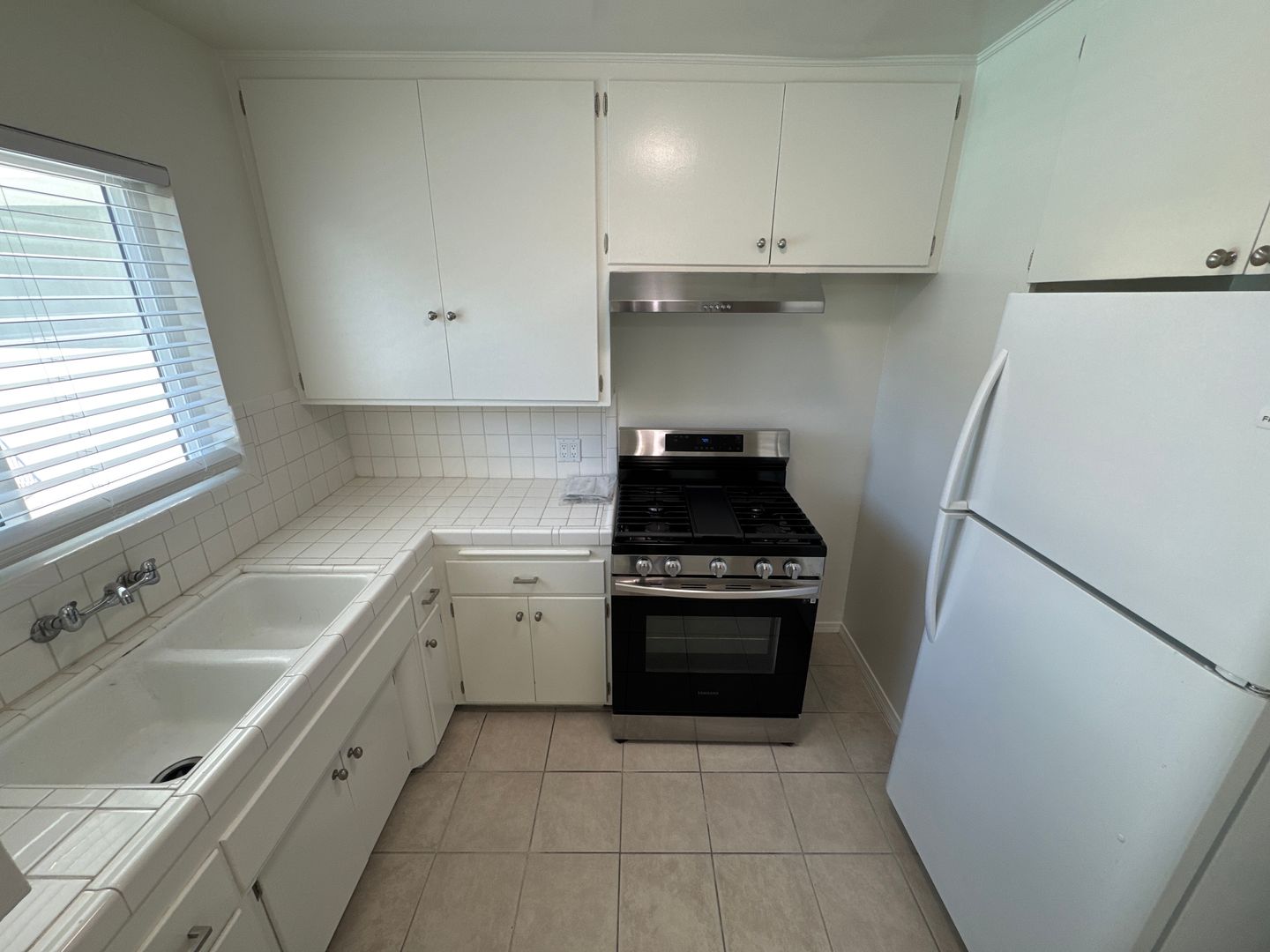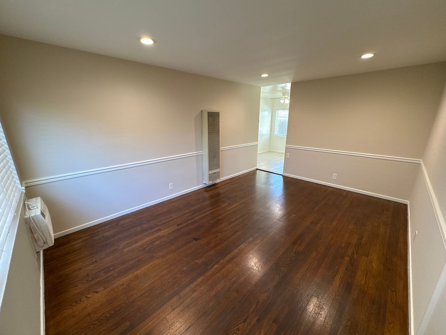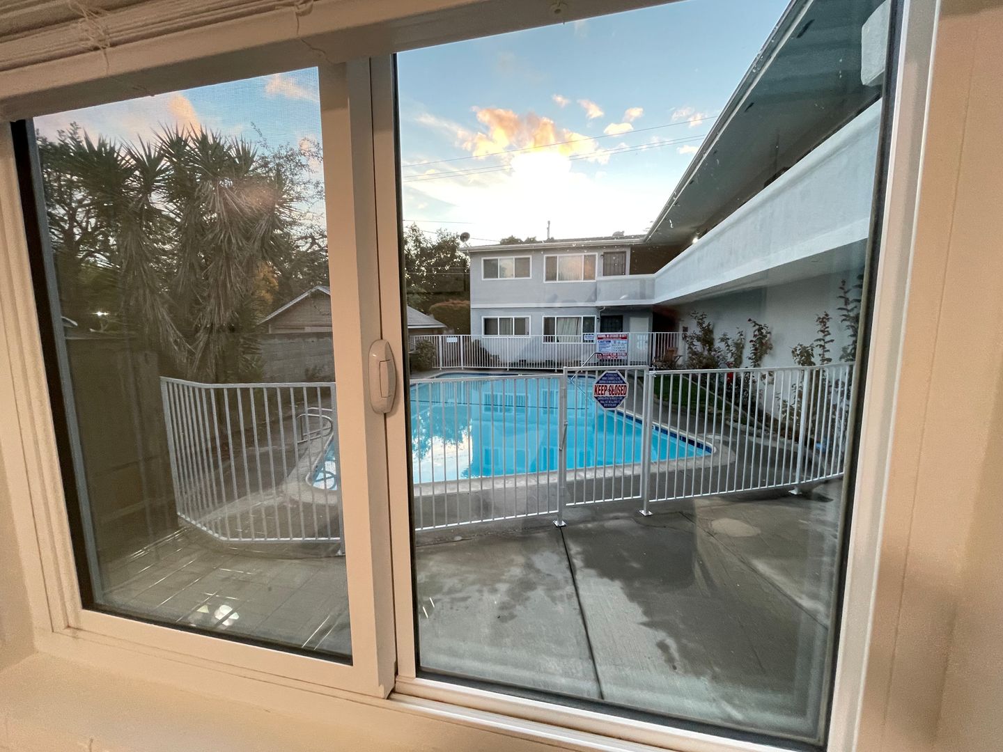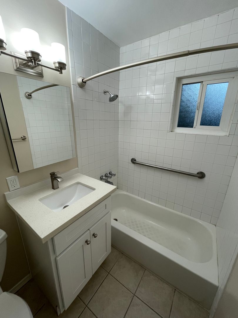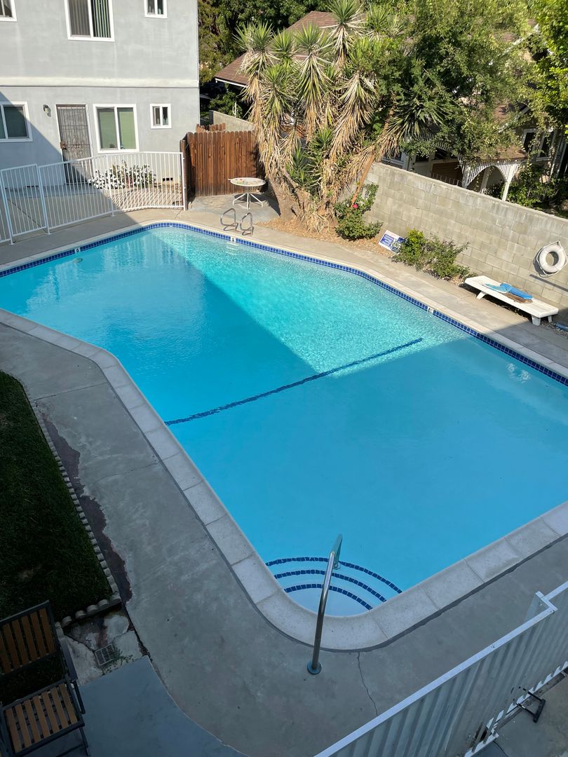 Quiet 1 Bedroom 1 Bath Lower level Unit. This charming unit has been freshened up and has refinished hardwood flooring, dual pane windows, has been freshly painted and the bathroom has been newly refinished with new cabinetry. Kitchen comes equipped with a Stainless Steel Stove/Oven and a Refrigerator and there is a separate dining area off the kitchen. This building boasts a Sparkling Pool, carport parking for 2 vehicles in tandem and Onsite Laundry.